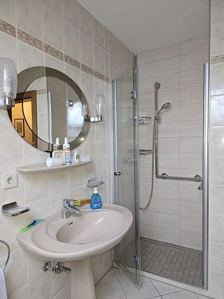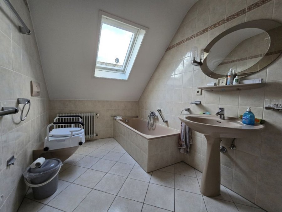 Im Obergeschoss befinden sich zwei drei Schlafzimmer und ein Badezimmer mit Badewanne und Dusche. Das größere Schlafzimmer verfügt einen großzügigen überdachten Balkon mit herrlichem Blick in den Garten.