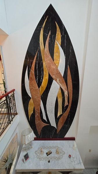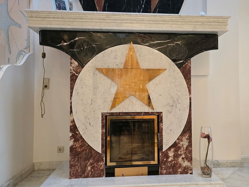 Ein Deckenausschnitt mit kleiner Galerie vereint Erd- und Obergeschoss. Der Stilkamin mit einer über zwei Stockwerke reichenden Marmorverkleidung ähnelt einer lodernden Flamme. Sämtliche Türen inklusive Türrahmen und teilweise Verglasungen wurden maßgefertigt.