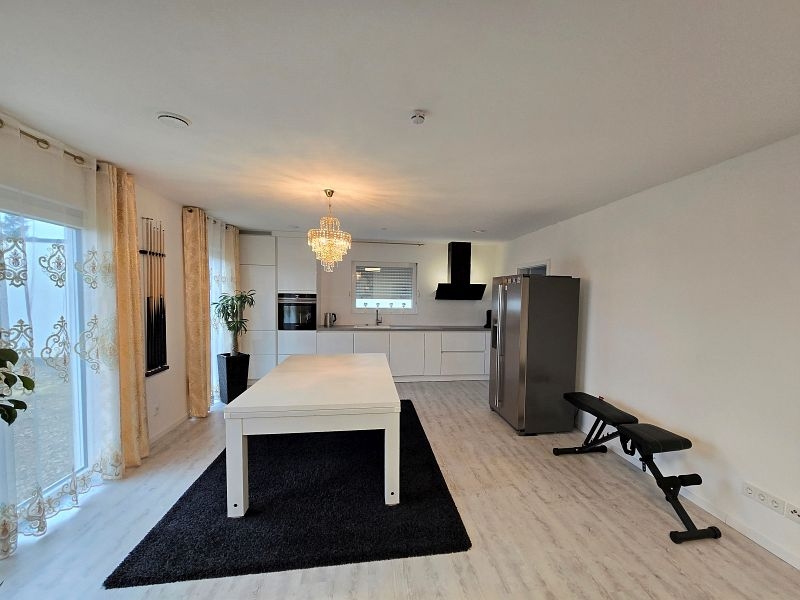 Der Wohn- und Essbereich verfügt über 4 große bodentiefe Fenster/Türen die den gesamten Wohnraum mit viel Tageslicht durchfluten. Vom Wohn- und Essbereich aus gelangen Sie direkt auf die Außenterrasse und in den Garten. Von hier aus genießen Sie einen unverbaubaren Blick über weite Teile des Ortskerns.