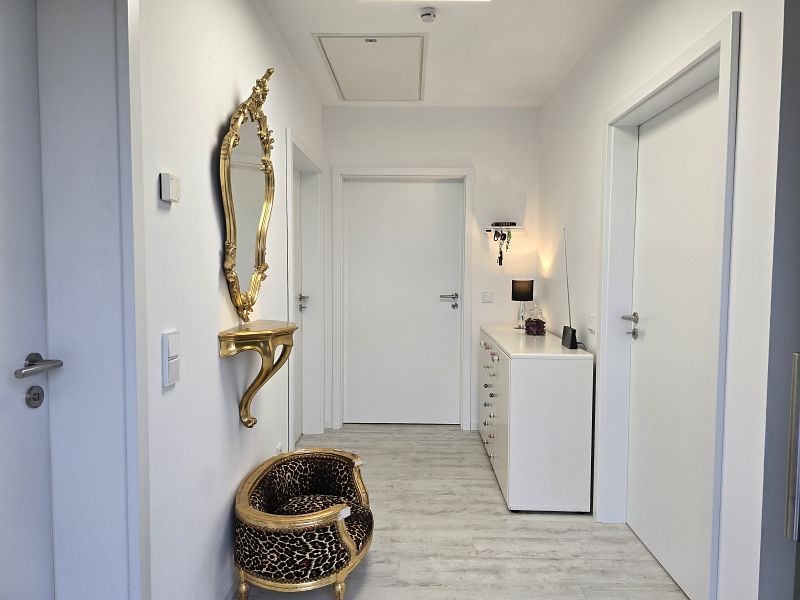 Das Wohnhaus verfügt über eine Diele mit Garderobe, ein Bad mit großer begehbarer Dusche, ein Schlafzimmer mit begehbarem Kleiderschrank, einen ca. 37 m² großen Wohn- und Essbereich mit zeitlos schöner, weißer Einbauküche und ein weiteres Schlaf-Gäste- oder Bürozimmer.