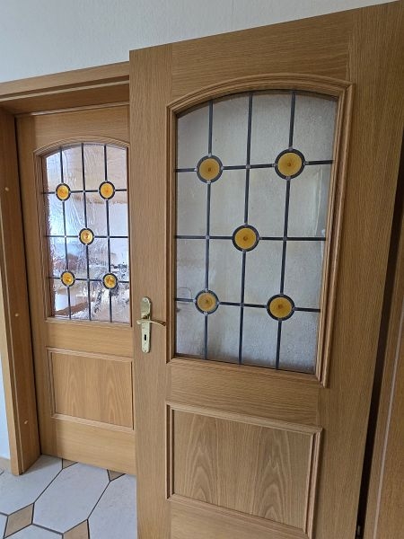 Der barrierefreie Wohnbereich im Erdgeschoss (ca. 130 m²) ist durch eine hübsche Kombination aus Glas und Holz mit Tür zum Treppenhaus abgetrennt. Das Erdgeschoss verfügt über eine großzügige Diele, zwei Schlafzimmer, ein Gäste-WC, ein Tageslichtbad mit BD, Badewanne und Dusche, eine Küche mit integrierter Einbauküche, zwei Abstell- und Vorratsräume und ein großzügiger Wohn- und Essbereich mit Zugang zum Garten und zur Außenterrasse.